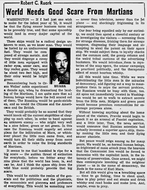 "He avers that if our Earth people suddenly found themselves threatened by attack from another planet, they would lose no time uniting as one in the common defense. Even Stalin would be preaching cooperation and anxiously seek our alliance and friendship."
